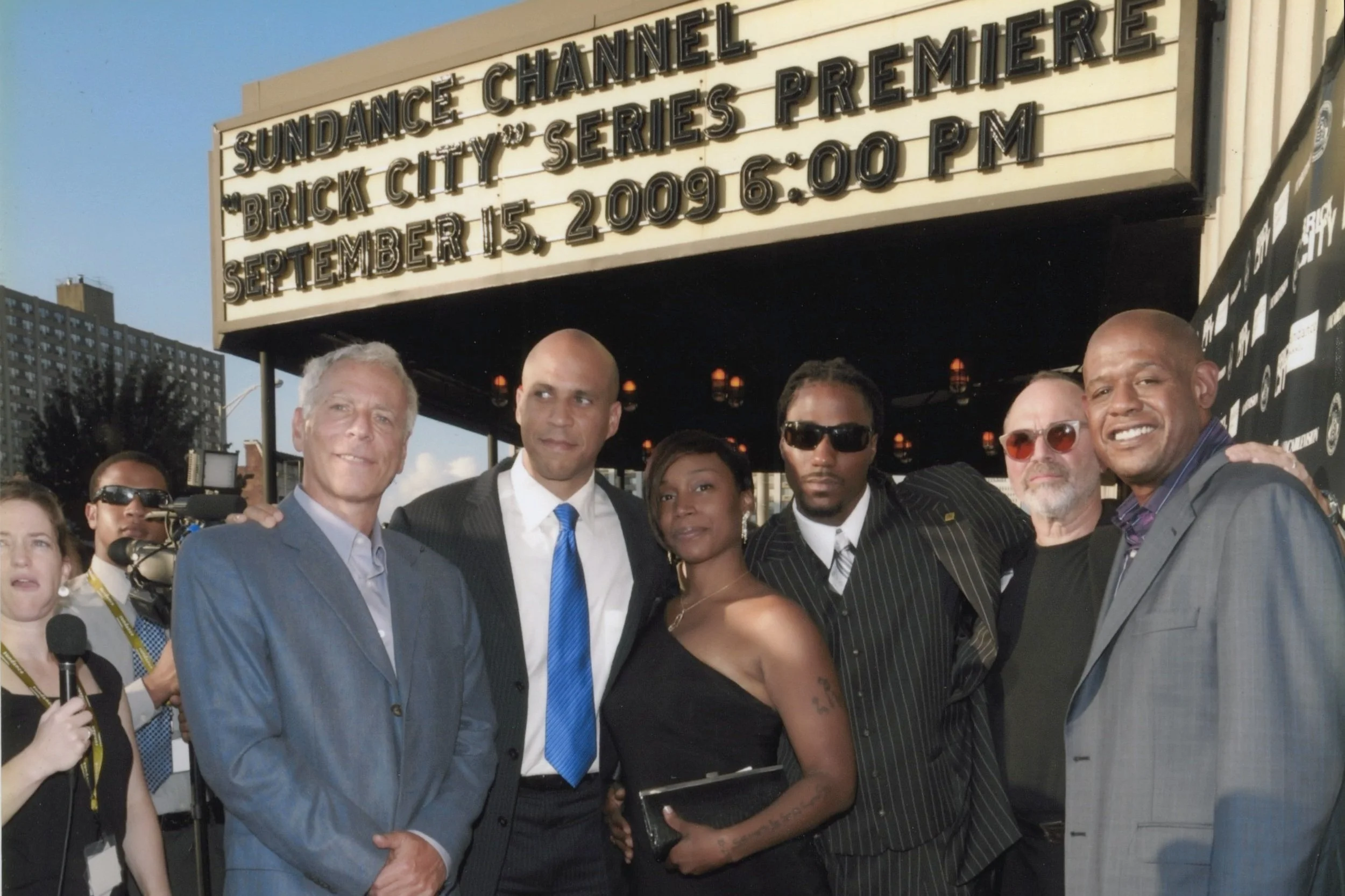 Marc Levin, Mayor Corey Booker, Jayda Jacques, Darel “Creep” Evans, Mark Benjamin, and Forrest Whitaker at the Brick City series premiere in New Jersey.
